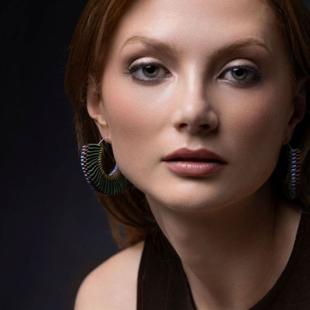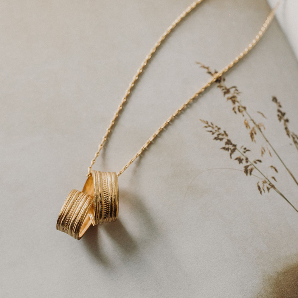 Emma Calvert explores the creative possibilities of textiles as jewellery, reimagining the interplay between fabric and metalwork. Trained in Woven Textiles at Central Saint Martins, Emma’s practice is rooted in a love of pattern and texture, which she explores from her Dorset studio creating pieces from both ribbons and precious metals.