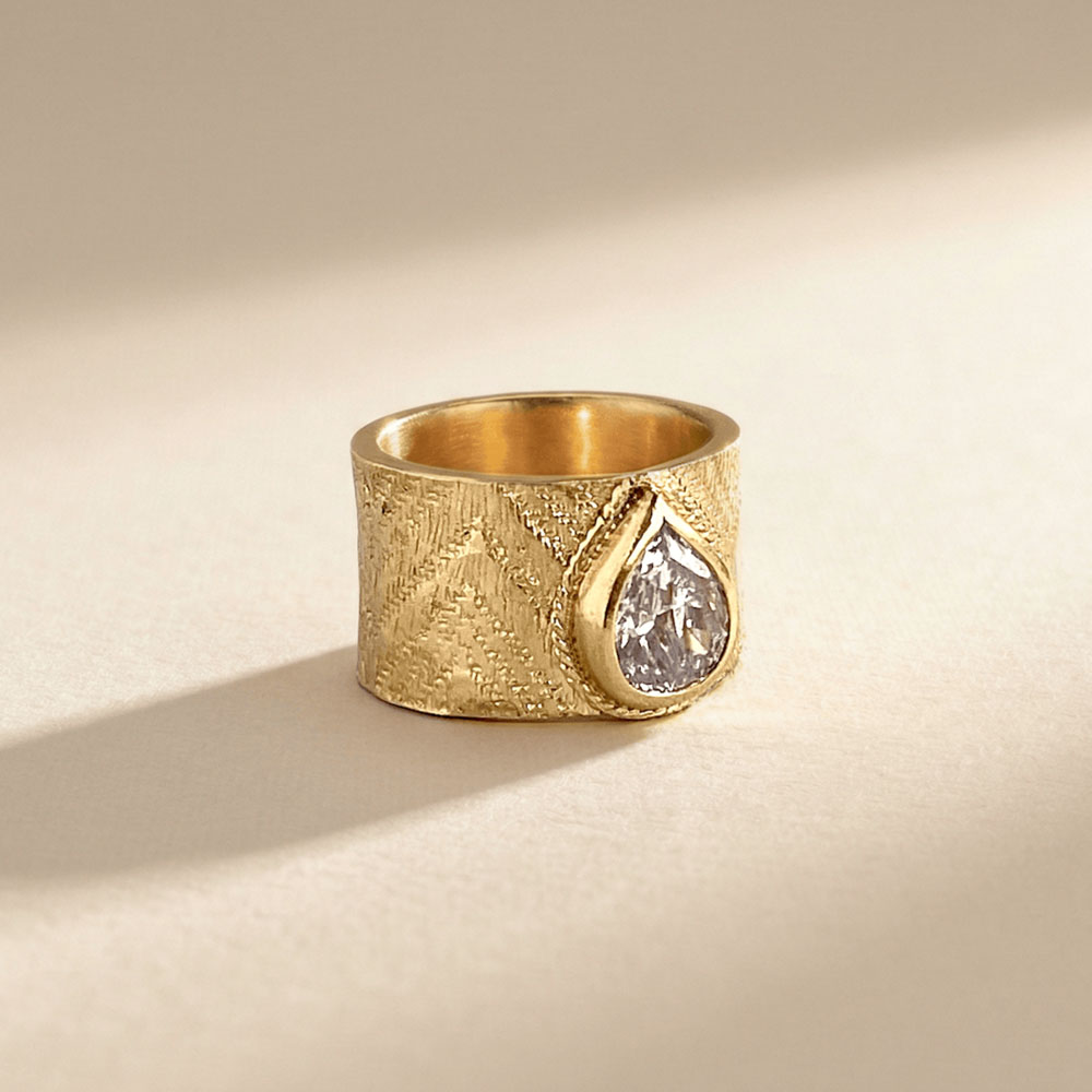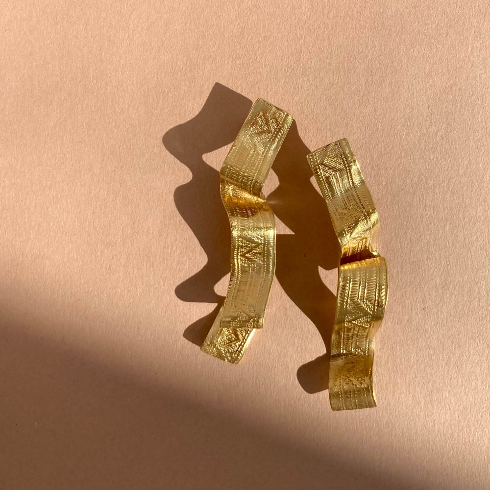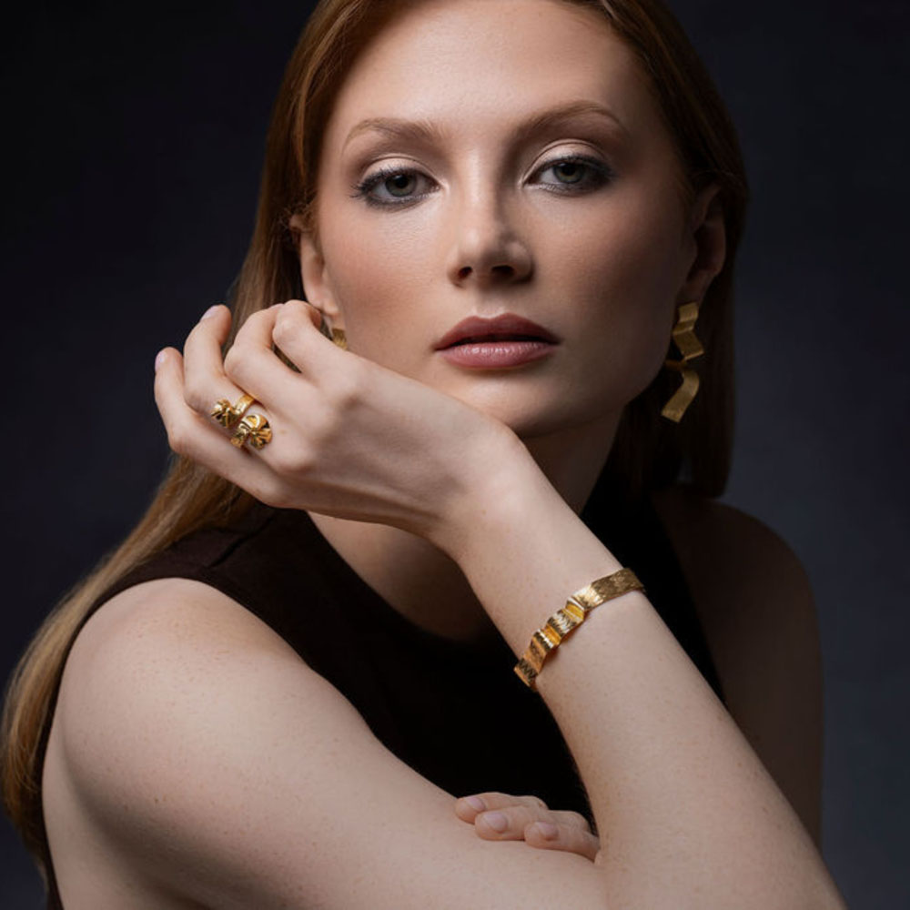 Her signature process involves casting antique ribbon textures into precious metals, from 16th-